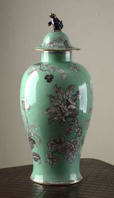 of tapering ovoid form, the cover with blue and gilt dog finial, the body decorated with monochrome lilies on a green ground, black printed mark