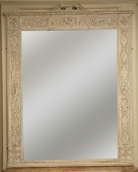 the rectangular mirror plate in moulded frame with ribbon tied harebell chains and figural tablet with swan neck pediment to the top