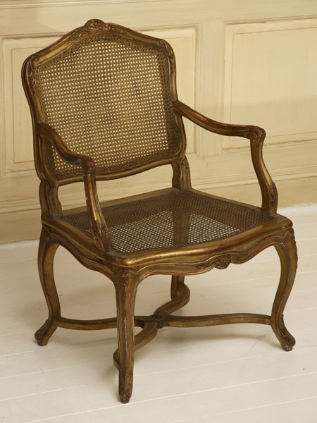 the cane filled cartouche shaped back and serpentine seat, in acanthus carved moulded frame, on cabriole legs joined by an X-stretcher