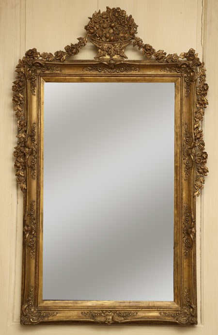 the rectangular mirror plate in moulded frame with floral shellwork sides and corners, with floral basket surmount issuing floral swags