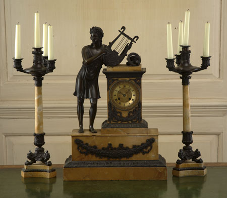 of Empire style, the clock with twin train movement striking on a bell, brass dial with Roman numerals, in pedestal case with a cast figure of a standing classical youth playing the lyre, resting to one side, on stepped swag mounted plinth; the two ensuite candelabra each with four candle sconces on turned column with three paw feet and stepped concave tripartite base (3)