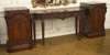 of George III style, comprising three sections, the serpentine centre section above scrolled acanthus carved frieze, on channelled foliate headed scrolled square legs, flanked on each side by a pedestal with panelled cupboard door, enclosing shelves, between foliate scroll carved canted corners, on gadrooned plinth base