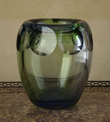 with frieze of large cut circles, 24cm high; and a similar blue glass vase, cut with leaf decoration, 21cm high (2)