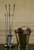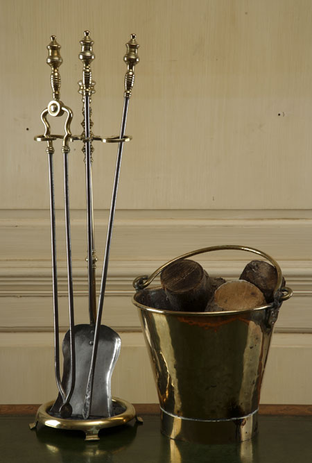 of George IV style, the shovel, poker and tongs with brass handles, the brass stand with circular footed base, 79cm high; and a 19th century brass bucket, with swing handle, both handle mounts marked, `H.E.POONA`, 30cm diameter (5)