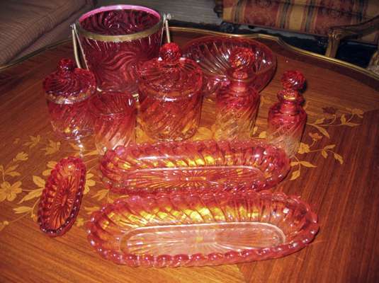 each with spirally decorated body of red glass graduating to clear glass, comprising: a two jars and covers; another jar, lacking cover; two bottles and stoppers; a pail; two long trinket trays; another, smaller; and a bowl (10)