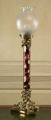 the red vine leaf decorated glass stem with cabochon, leaf and husk collars, the foliate scroll triform base with a plinth