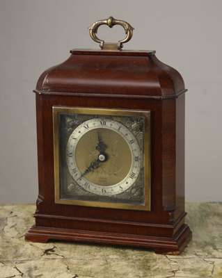 by Tiffany & Co the brass dial with steel chapter ring and mask spandrels, within a domed and canted mahogany case with loop handle