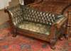 of Empire style, the back, outscrolled arms and seat covered in close nailed button upholstered green leather, plain seat rail, on hairy legs with paw feet