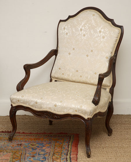 of Louis XV style, the waisted arched rectangular back and serpentine seat covered in cream floral fabric, scrolled arms, the seat rail centred by carved shell, on carved cabriole legs
