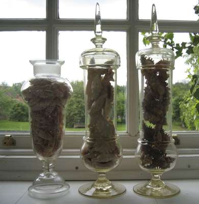each with spire form stopper above cylindrical body, with bulbous base on spreading circular foot; and another, lacking cover (3)