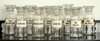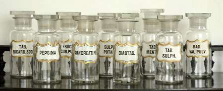 each with octagonal flattened stopper above cylindrical body with cartouche shaped label framed in gold and with black printed lettering (9)