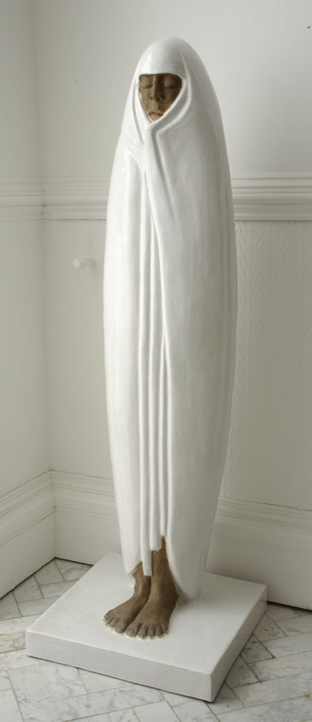 modelled standing swathed in white robe, painted face an feet, on square plinth, signed ‘C L’