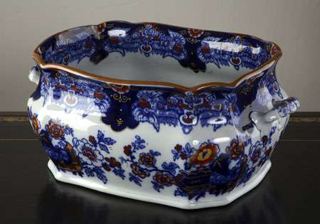 of rectangular form with scalloped border, blue printed red enamelled with flowers, printed Royal coat of arms to underside