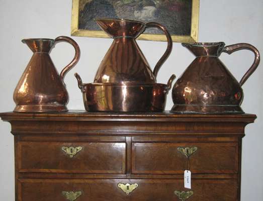 of bellied form, 39cm high; a Victorian copper two gallon measure, of squat bellied form, 31cm high; a Victorian copper preserve pan; and a copper gallon measure (4)