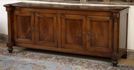 of Empire style, the eared moulded rectangular top above four panelled cupboard doors, flanked on each side by a turned column, on squat baluster turned legs