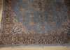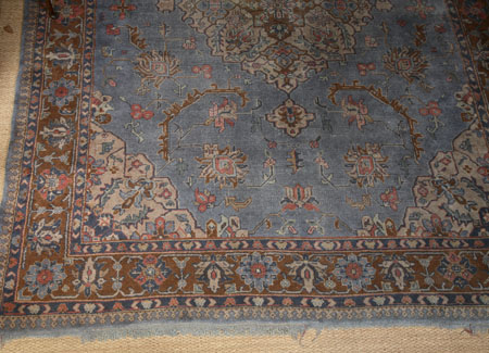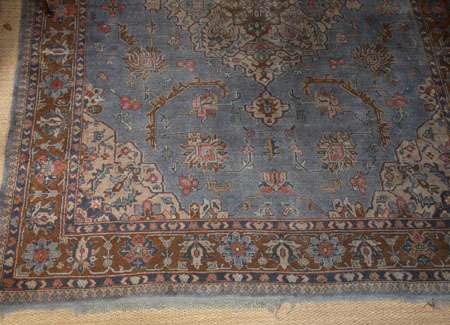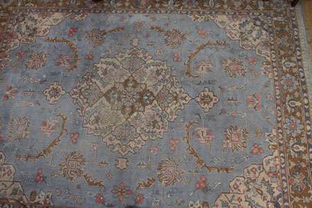 the blue field with central cream and brown medallion suspending pendants, cream pendants, within brown rosette and vine border between blue bands