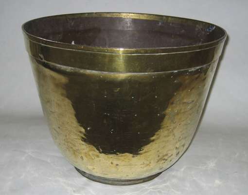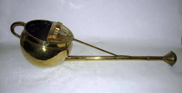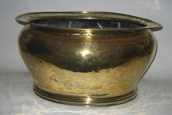 with a long arm and two carry handles, top with oval portrait medallion, 100cm long; a large embossed brass jardinière, with stylised coat of arms and lion mask ring handles, on a lobed domed base, 65cm high; a brass jardinière, 43cm diameter; and another jardiniere, 55cm long (4)