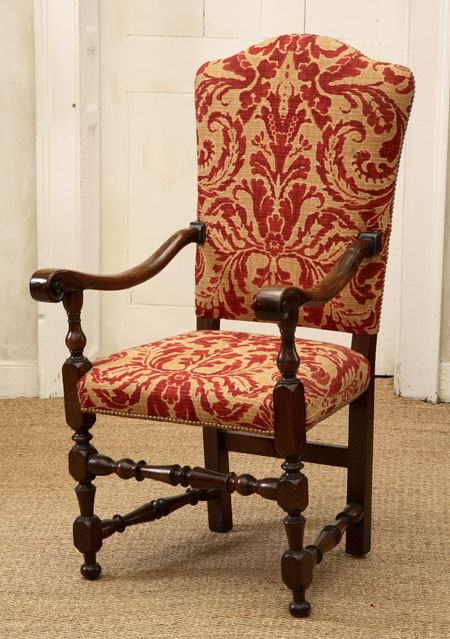 of Louis XIV style, the arched rectangular back and seat covered in close nailed red and gold floral fabric, scrolled arms, on turned and block legs joined by similar stretchers, on bun feet