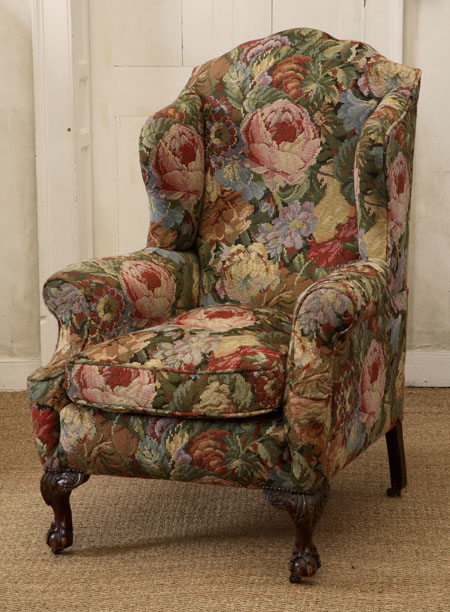 each with arched back, wings, out scrolled arms and cushioned seat covered in floral tapestry style fabric, on stained beech acanthus carved cabriole legs with claw and ball feet fitted with castors (2)
