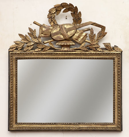 the rectangular mirror plate in ball and stiff leaf moulded frame, with musical trophy and laurel wreath carved surmount
