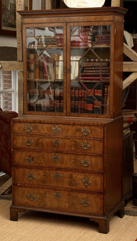 the moulded dentilled cornice above ebony and boxwood line inlaid frieze, over similarly inlaid astragal glazed doors, enclosing adjustable shelves, the projecting lower section with hinged secretaire drawer, enclosing fitted interior, above three long graduated drawers, on bracket feet