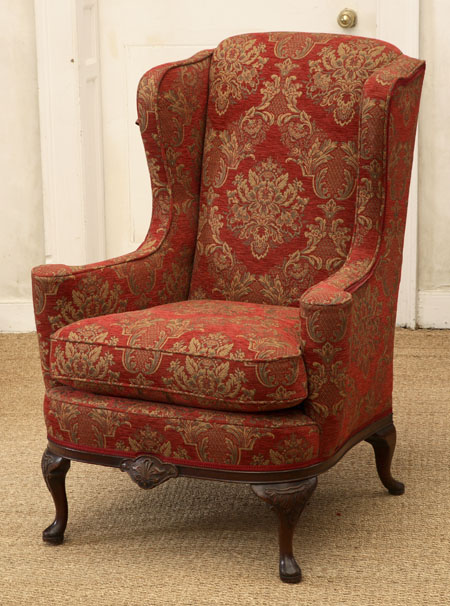 the back, wings, outscrolled arms and cushioned seat covered in red floral fabric, on acanthus carved cabriole legs with pad feet