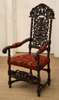 of Carolean style, the arched cresting and back carved and pierced all over with scrolling foliage and figures, carved down scrolled arms, the upholstered seat on spirally turned and block legs, joined by similar H-stretcher and with carved and pierced front stretcher, on ball feet