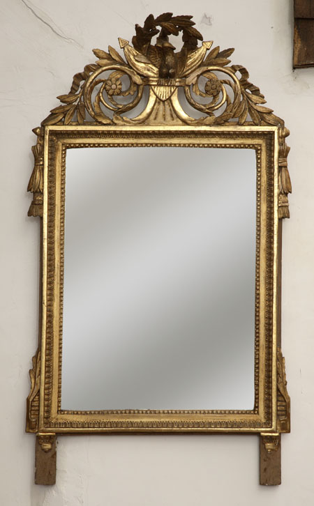 the rectangular mirror plate in ball and stiff leaf moulded frame, with scrolling acanthus carved surmount centred by a bird and wreath