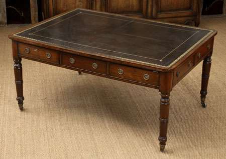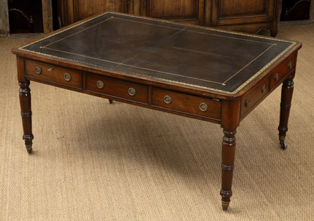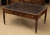 the rounded rectangular top inset with gilt tooled leather writing surface, above three frieze drawers to each long side, two false drawers to the short sides, on baluster turned tapering legs with brass caps and castors