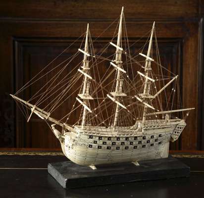 of Napoleonic Prisoner-of-War style, the three main masts with yards and booms, rear inscribed 'VICTORY', on a black painted plinth