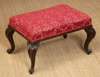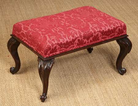 the rectangular seat upholstered in purple velvet damask fabric, on acanthus carved cabriole legs with scrolled feet