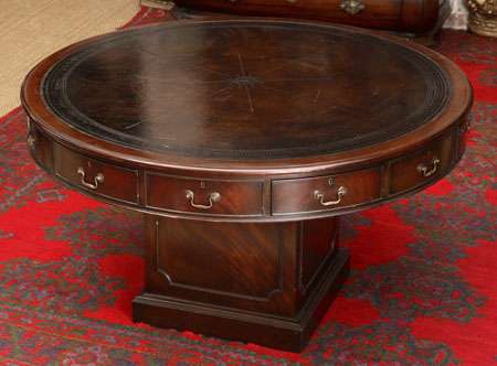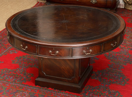 of George III style, the moulded circular top inset with tooled leather writing surface, above six frieze drawers, alternating with dummy drawers, on panelled square section column and plinth base