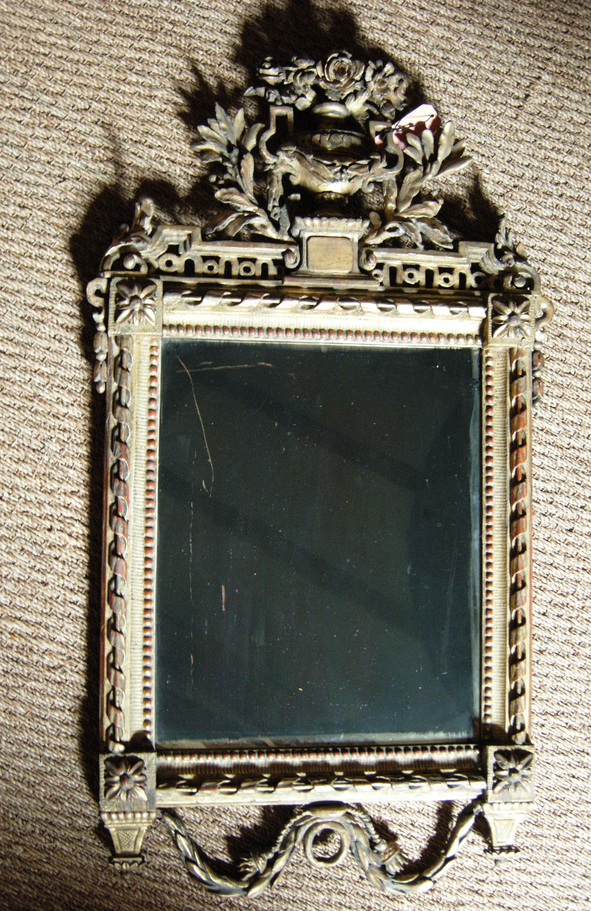 the floral urn and balustrade cresting above a beaded and open spiral frame with trailing husk apron