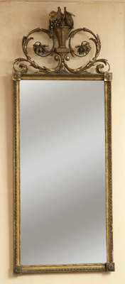 the rectangular mirror plate in moulded frame with rosette corners, surmounted by carved scrolling acanthus and a basket of fruit