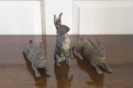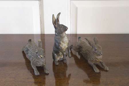 stamped 'GESCHUTZT'; and a further similar cold painted bronze of a seated hare (3)