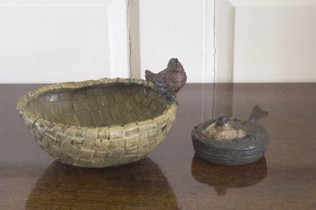in the form a woven basket surmounted by a wren; and a cold painted bronze box, modelled as a nesting swallow (2)