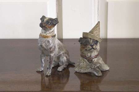 in the form of a terrier wearing a conical hat; and a cold painted bronze figure of a seated terrier (2)