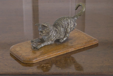 in the from of a tabby cat catching rat, on a sprung support and wood base