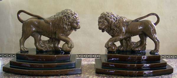 each standing with one paw raised on a ball, on a stepped plinth, modern, (2)