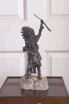 in the form of a Red Indian holding aloft a rifle, signed 'C. Kauba', stamped 'GESCHUTZT', raised on a naturalistic alabaster base