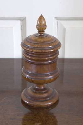 the domed lid with an acorn finial, raised on a socle base, 25cm high; a walnut covered biscuit barrel, 21cm high; and a small hardwood box (3)
