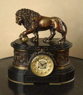 the movement striking on a coiled gong, the brass dial with cast centre and Arabic numerals, the case with stepped breakfront oval plinth top surmounted by a Medici lion and ball, above circular glazed dial flanked by frieze of classical figures in low relief, on stepped oval breakfront plinth base