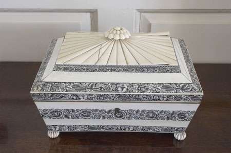of sarcophagus form, the reeded lid and sides decorated with bands of fruiting vines, opening to reveal a fitted interior, raised on lobed bun feet