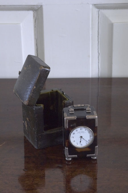 A Victorian silver mounted tortoiseshell travelling clock retailed by Albert Barker, 5 New Bond Street, London