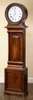 the twin train movement striking on a bell, the later white enamelled circular dial with Roman numerals and subsidiary seconds dial, the drum hood with glazed circular door with moulded frame, the case with bowfront trunk door with arched moulding above, flanked by turned columns, on panelled base with bracket feet