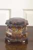 of octagonal form, the ogee moulded hinged lid enclosing covered compartments, raised on four ivory bun feet