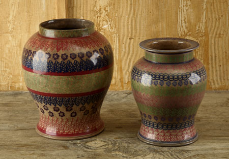 with bands of pink, blue, purple and green geometric and floral decoration, impressed mark, 23cm high; and another, similar, unmarked (damages) 27cm high (2)