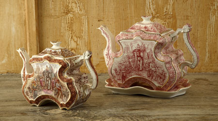 of cartouche shape, the borders decorated with flowers, each side decorated with a scene showing elephants and figures with hunting dogs, printed ‘registered shape 28178 C’ and impressed registered number 281720, 21.5cm wide; and another, similar, red printed, with matching shaped stand, 27cm wide (3)
