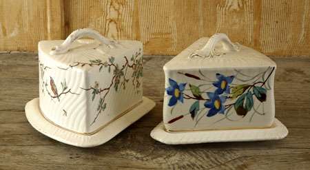 with twig form handle, painted with birds and blossom, impressed mark, 22.5cm wide; and a 19th century German wedge shaped cheese dish and cover with scroll handle, painted with flowers and foliage, impressed mark, 22.5cm wide (2)
