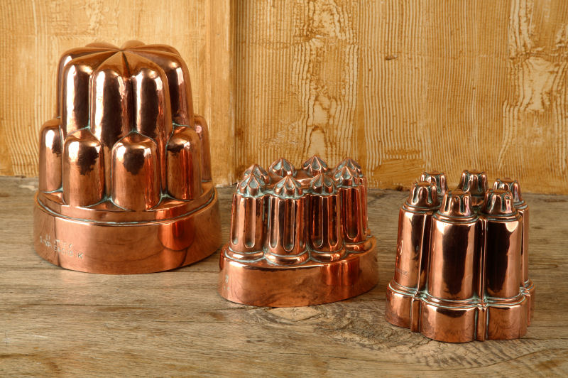 of circular lobed form, stamped ‘LENT BY TEMPLE & CROOK’, 19cm diameter, 21cm high; a Victorian copper mould, stamped ‘McMANUS BELGRAVE’, 13cm high; and a Victorian oval fluted mould, bears Benham and Froud mark, 18cm long (3)